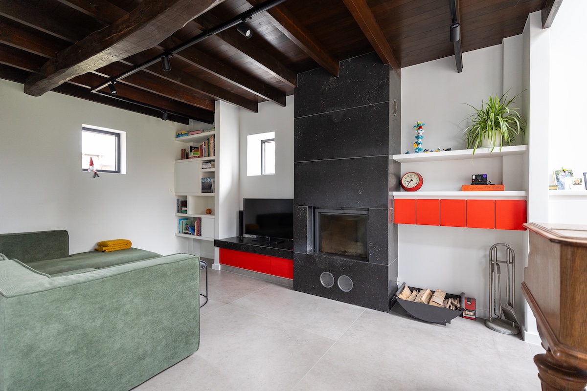 In Meerhout realiseerden we een stijlvolle blikvanger in de zithoek: een boekenkast op maat met verschillende compartimenten.